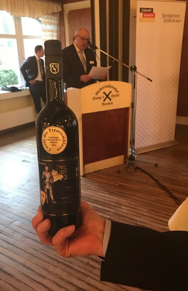 Die Redner bekamen eine kleine aber feine Aufmerksamkeit: je eine Flasche Rotwein - „Der schwarze Baron“ sowie ein Buch über die Senioren-Union.