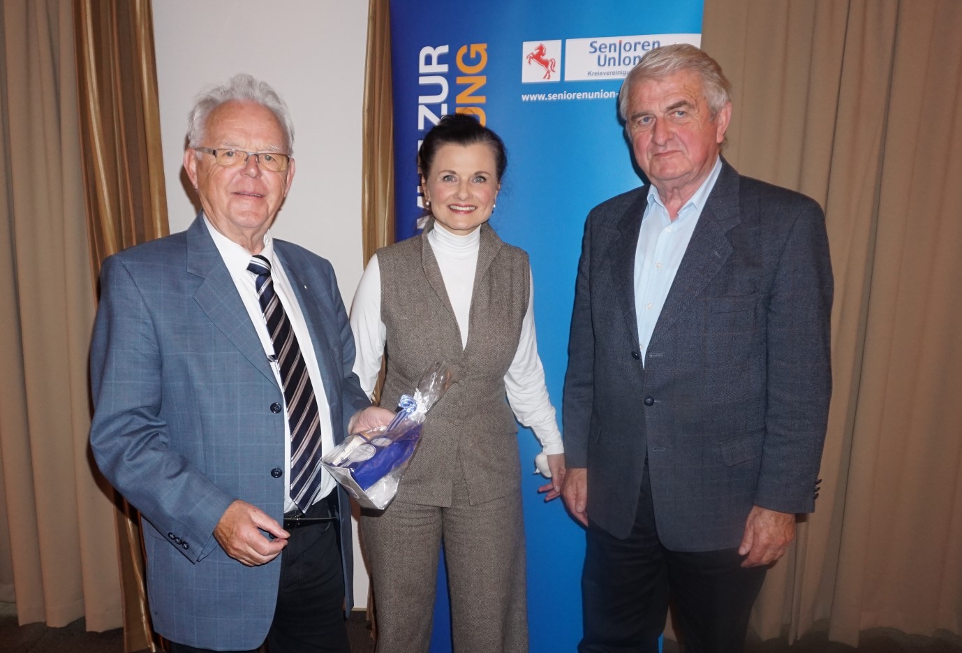 Trotz ihrer Handverletzung - direkt von der Veranstaltung aus musste Frau Connemann wieder zur Nachbehandlung ins Krankenhaus nach Leer - freuten sich Gerd Samuels und der Vorsitzende der Wittmunder Seniorengemeinschaft der CDU, Adolf Janssen über den Vortrag zum Thema: