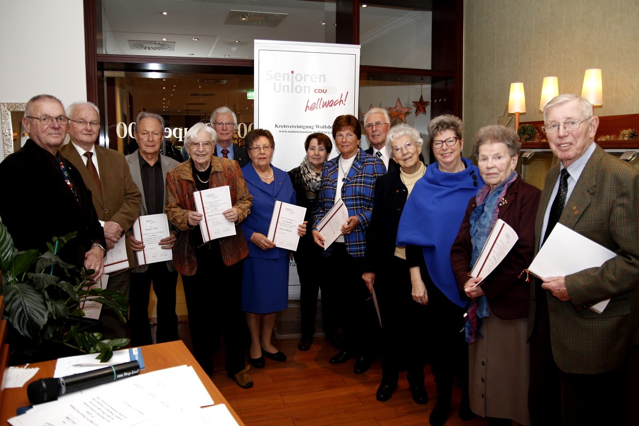 Das Foto zeigt: die Kreisvorsitzende der CDU, Angelika Jahns MdL (3. von rechts), den SU-Kreisvorsitzenden Günther Odenbreit (5. von links), Beisitzerin im Landesvorstand Erika Koegel (7. von rechts) sowie einige der Jubilare. Während des Adventskaffees wurden langjährige Mitglieder geehrt: Für 10 Jahre Mitgliedschaft: Werner Mühe, Helga Ruda, Hannelore Jandt, Elsa-Maria Annuss, Manfred Jandt, Helmuth Reichard, Dr. Gabriele Trzonnek und Klara Wiebe.