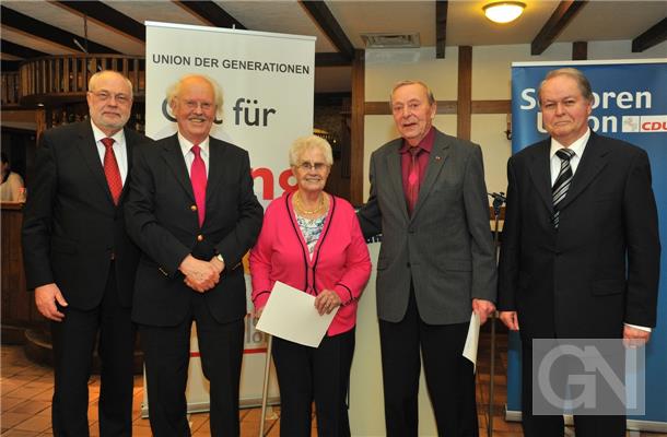 Alberdine Klinge (dritte von links) und Berhard Voshaar (zweiter von rechts) wurden für ihre langjährige Mitgliedschaft von Rainer Hajek, (links), Prof. Dr. Otto Wulff, (daneben), und Wolff-„Die Senioren-Union der CDU ist das „Sprachrohr der älteren Bevölkerung der Grafschaft“, betonte Landrat Friedrich Kethorn. Das 25-jährige Jubiläum feierten die Mitglieder der Senioren-Union am 20. Februar 2014 mit dem Bundesvorsitzenden Prof. Dr. Otto Wulff lar NORDHORN. Zum 25. Geburtstag der Grafschafter Senioren- Union der CDU konnte der Kreisvorsitzende Wolff-Rüdiger Kopper 135 aktive Mitglieder im Hotel Rammelkamp in Nordhorn emp-fangen. Die am 20. Februar 1989 gegründete Vereinigung ist mit rund 250 Mitgliedern die größte CDU-Organisation auf Kreisebene und nach der Jungen Union auch die zweitstärkste auf Bundesebene, informierte Kopper zu Beginn der Veranstaltung. Neben den Senioren war er besonders erfreut, den Kreisvorsitzenden der CDU, Reinhold Hilbers, Landrat Friedrich Kethorn, den Landesvorsitzenden Rainer Hajek und den Bundesvorsitzenden der Senioren- Union der CDU Deutschlands Professor Doktor Otto Wulff begrüßen zu dürfen. Der sich selbst als Mitsenior und bekennendes CDU Mitglied bezeichnende Landrat Kethorn teilte mit, dass von den 135 000 Menschen, die im Landkreis Grafschaft Bentheim leben, 26 000 älter als 60 Jahre sind: Mit diesen Zahlen im Hinterkopf und einem besonderen Blick auf den demografischen Wandel und einer veränderten Alterspyramide hätten die Gründer der Grafschafter Senioren- Union vor 25 Jahren frühzeitig erkannt, dass es einen Verein geben müsse, der sich um die Fragen der älteren Menschen kümmere. Das Potenzial der über 60- Jährigen dürfe nicht verschenkt werden, meinte Hilbers in seinen Grußworten: „Was damals mit 50 Menschen klein begann, ist heute mit 257 Mitglie-dern eine starke Vereinigung. Sie haben sich prächtig entwickelt und einen starken Einfluss, zum Beispiel in der Heimatgestaltung, betonte er. Weiterhin bewundert der Kreisvorsitzende und CDU Landtagsabgeordnete, dass die Senioren ein gu-tes Fundament aufgebaut hätten und aus den christlich-demokratischen Grundsätzen heraus erfolgreiche Politik machten: „Die Mitglieder der Senioren-Union sagen, was sie denken und tun, was sie sagen.“ Er appellierte an die anwesenden Senioren: „Aus dem hohen Schatz an Lebenserfahrung müsst ihr den jungen Leuten unsere Grundsätze mit auf den Weg geben.“ „Die Senioren von heute sind in einer Welt aufgewachsen, in der das Leben am Abgrund stand. Sie haben nicht gezweifelt, sondern mit angepackt“, betonte Wulff. Wenn man auf die Zukunft blicke, sollte man die Quellen kennen und sich der Verantwortung bewusst sein, was damals gewesen ist. Trotz allem erlebten Elends hätten die Senioren ein positives Denken: Kraft, Moral und Bewusstsein. In seinem Festvortrag führte er vier wichtige Aspekte auf, an denen aktiv gearbeitet und für die Lösungen gefunden werden müssten. Bekennendes Alter: „Was ist das für ein Bild, das manche abgeben, die sich nicht zum Alter bekennen?“ Die ältere Generation müsse ein Vorbild und Ansprechpartner für die Jugend sein. Respekt und Autorität könne man sich durch Erfahrung verdienen. „Wenn wir den Kindern vorleben, dass das Alter eine Leidensposition ist, wer traut sich dann noch alt zu werden?“, fragte er. Kompromisse eingehen: Für ältere Menschen stehe oft die Altersarmut am Ende eines Lebensabschnitts. Doch was passiert, wenn die jüngere Generation den Forderungen der Älteren nicht nach-komme? „Wie werden wir das lösen?“ Wulff ist sicher: Gemeinsame Politik mit den jüngeren Generationen ist der Schlüssel zur Lösung. Kinderförderung: Wulffs dritter Aspekt drehte sich um eine Förderung der Familien: „Ich gehöre zu denen, die Kinder nicht als Belastung empfinden. Kinder halten eine Familie zusammen, sind wertvoll und sollen der Sinn des Lebens sein.“ Der starke Applaus der Senioren bestätigte ihn in dieser Aus-sage. Der christliche Gedanke, der die CDU ausmache, war sein letzter Punkt. Seine Frage: Gibt es in dieser Informationsgesellschaft, wo jeder von jedem angehört werden könne, noch eine Privatsphäre? „Nach dem Christentum ist jeder frei vor Gott – er muss nur die Verantwortung für diese Freiheit tragen. Ich wünsche mir Freiheit in der Welt.“ Aus Sicht Koppers hielt der Bundesvorsitzende Otto Wulff einen „besonders leidenschaftlichen und rhetorisch unverwechselbaren“ Vortrag. Zum Ende der Veranstaltung wurden Alberdine Klinge und Bernhard Voshaar geehrt. Beide waren vor 25 Jahren bei der Gründung dabei und sind seitdem mit viel Leidenschaft in der Grafschafter Senioren-Union aktiv. „Ich danke Ihnen und hoffe, Sie werden die nächsten Jahre mit Verantwortung und Nächstenliebe gestalten“, sagte Wulff abschließend.
