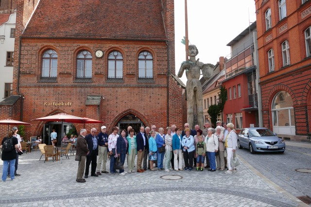 Das Foto zeigt die Gruppe vor der Roland Statue der Stadt StendalDer OB vermittelte den Wolfsburgern interessante Einblicke in die fast 1000-jährige Geschichte der alten Hansestadt. Bei dem anschließenden Stadtrundgang unter fachkundiger Führung beeindruckte Stendal mit seiner Backsteingotik und seinen vier großen Hallen- bzw. Ratskirchen und der gepflegten Innenstadt.