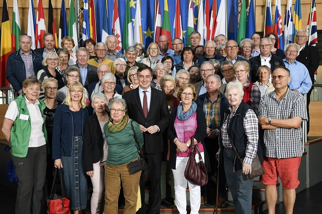 Gruppenfoto mit David McAllister, MdEP im Parlament (Foto Philippe Stirnweiss)Besonderer Höhepunkt der Reise: Die Teilnehmer konnten die Grundsatzrede des französischen Präsidenten Emmanuel Macron live von der Besuchertribüne aus erleben.
