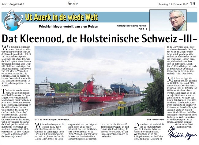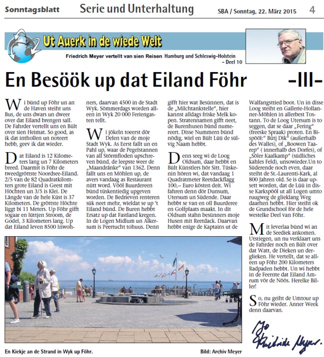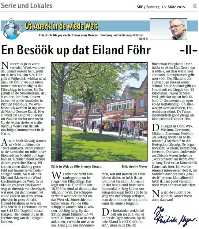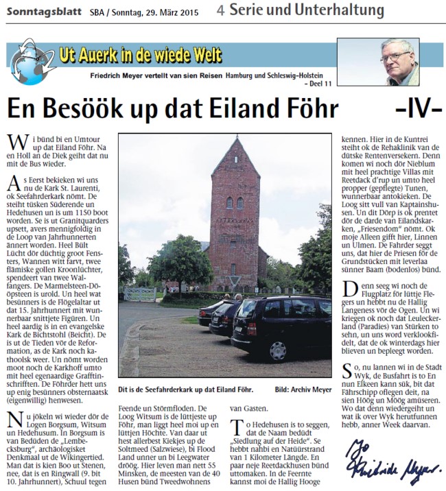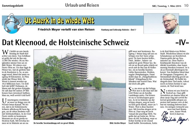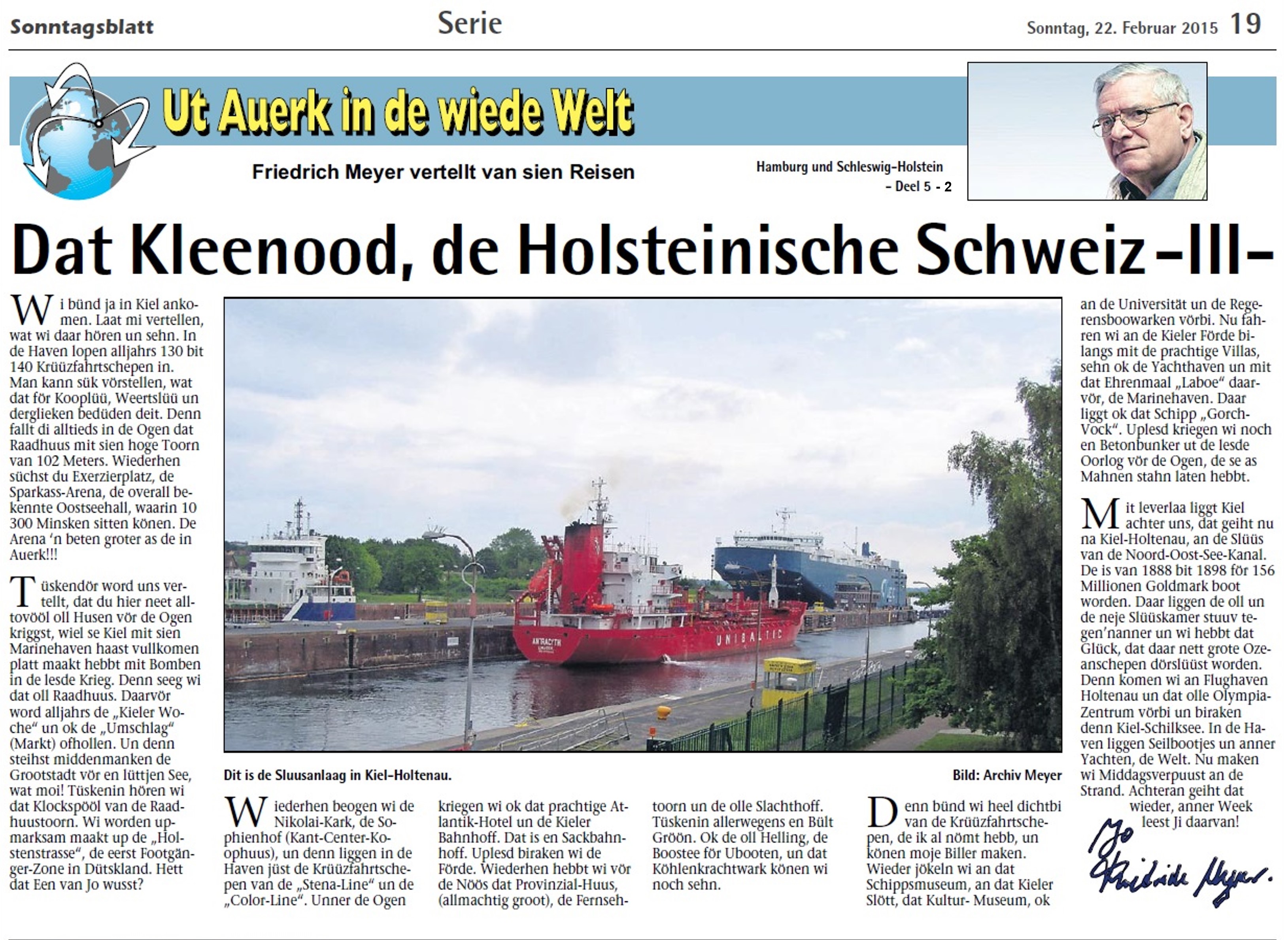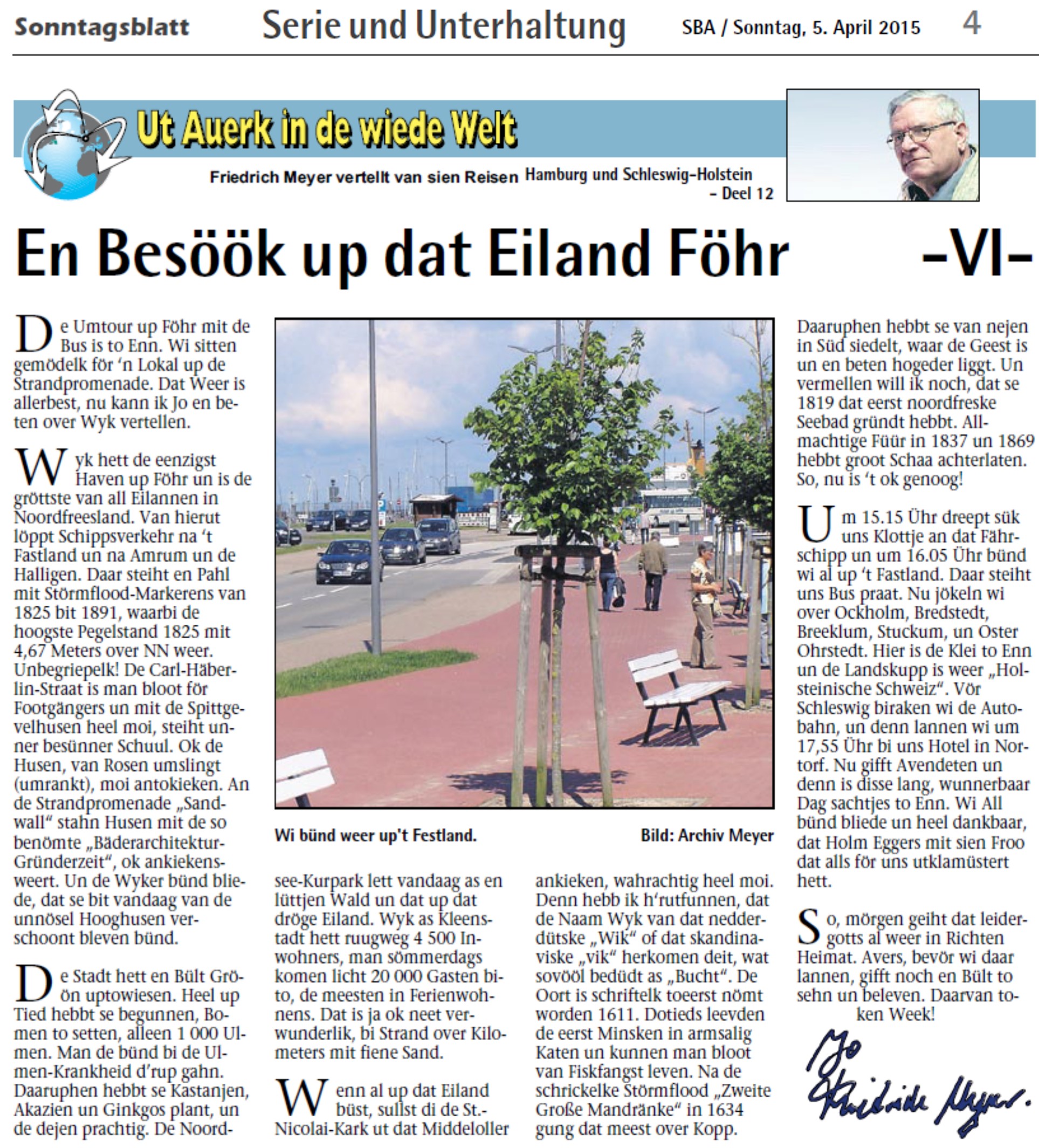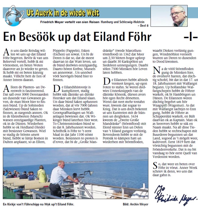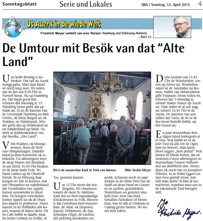 Hier nun der dreizehnte und leider letzte Teil von unserer wunderschönen 4-Tages-Fahrt nach Hamburg und Schleswig-Holstein...Friedrich Meyer hat sie so ansprechend auf plattdeutsch geschrieben, seine Reiseberichte sollen hier einer breiten Leserschaft zugänglich gemacht werden. Vielen Dank lieber Fiddi für Deine tollen Berichte!