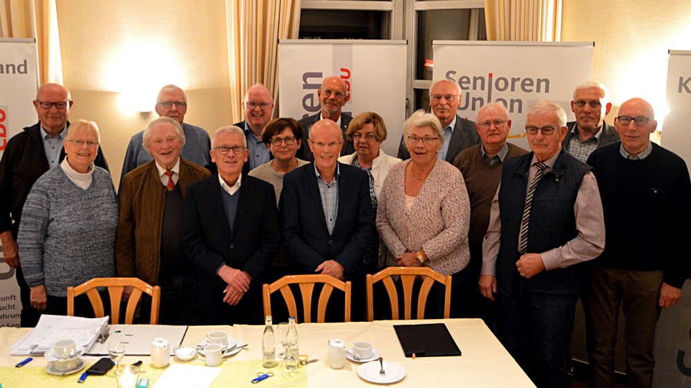 v. links: Gisbert Dödtmann, Edeltraut Bohmann, Helmut Backhaus, Eckhard Vogt, Manfred Ostendorf, Dr. Stefan Siemer, Waltraud Boving, Franz-Josef Schumacher, Heinz Bröer, Maria Schoe, Ingelore Meistermann, Hans Hoymann, Bernhard Reinken, Hermann Josef HaveVechta (cf). Im Mittelpunkt der Generalversammlung am 30.10.2019 der Senioren-Union (SU) im CDU-Kreisverband Vechta im Gasthaus Sextro standen die von CDU-Kreisgeschäftsführer Walter Goda geleiteten Wahlen zum Vorstand. Einstimmig bestätigt wurden: Manfred Ostendorf (Vechta) Vorsitzender, Heinz Bröer (Holdorf) stellvertretender Vorsitzender, Hans Hoymann (Dinklage) stellvertretender Vorsitzender, Waltraud Boving (Damme) Schriftführerin und Franz-Josef Schumacher (Damme) Schatzmeister sowie die Beisitzer Edeltraut Bohmann (Mühlen), Gottfried Grieshop (Vechta), Hermann Josef Haverkamp (Holdorf), Hermann Nordmann (Dinklage), Bernhard Reinken (Damme) und Eckhard Vogt (Lohne).